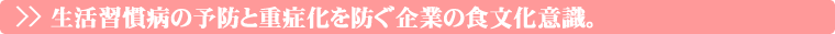 | 日本の中小企業にとって熟練した雇用者の安定雇用は、経営活動にとって重要であると同時に、生活習慣病などの発症と重症化を防ぎ医療費を抑制することに努め、企業と健保組合、社員が一体となって健康への意識と行動を変え、乱れた食生活、運動不足、睡眠不足、過度の飲酒、喫煙、過重ストレスなどの悪習慣が原因といわれる生活習慣病の発病と重症化を防ぐ「ハイリスクアプローチ」への取り組みをはじめています。医療費の約3割を占めるとされる生活習慣病患者を減らす効果は、定期的健診受診もさることながら毎日の各自に応じたバランスのとれた食事の実践が大切です。 | |