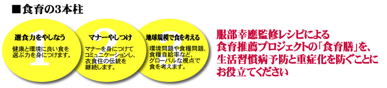 | 服部幸應先生の監修・協力提携による「食育基本法」を基本とした食育推進プロジェクト/Shoku-iku Projectでは、PFCバランス、プロの美味しさだけではなく、衛生管理から食材トレサビリティー(生産地の管理)調味料メーカー・商品名指定、地産地消を原則として、服部栄養専門学校 服部幸應先生が開発・監修したレシピを基に地産を活かした味付け調理「食育膳」として、全国の病院・学校・幼稚園・老人施設・産業給食・委託給食・料理教室・仕出し・スーパー・惣菜店・お弁当・配食・ホテル・レストラン・社員食堂など、食に関する様々なシーンでご活用いただいております。 |
